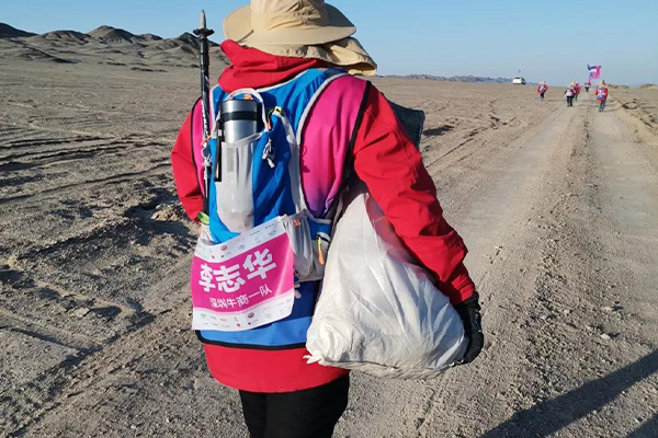 一路上走來,那是最美的照片,當我們步履蹣跚的時候,深圳的李志華他抱著纖維袋,一路撿垃圾,走過的路他一共撿了17袋垃圾。蒼穹之下戈壁中人是何等的渺小,這一個小小的舉動卻又是多么的高大,讓人敬佩感動!