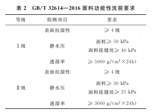 GB/T32614—2016《戶外運(yùn)動(dòng)服裝 沖鋒衣》 標(biāo)準(zhǔn)依據(jù)沖鋒衣的功能指標(biāo)對(duì)其進(jìn)行了級(jí)別劃 分。I級(jí)產(chǎn)品的防水透濕要求最為嚴(yán)格,適用于 專業(yè)戶外活動(dòng);II級(jí)產(chǎn)品相對(duì)I級(jí)產(chǎn)品的防水透 濕指標(biāo)稍低,可滿足日常的戶外休閑等活動(dòng)。對(duì) 于劃分I級(jí)、II級(jí)的功能性指標(biāo),應(yīng)在吊牌中標(biāo)注 “I級(jí)”或“II級(jí)”,不標(biāo)注的均視為I級(jí)產(chǎn)品。面料 功能性又分洗前和洗后要求,本文考慮了樣品成 本和比較目的達(dá)成兩方面的原因,只測(cè)試和比較 面料功能性洗前要求,見表2。