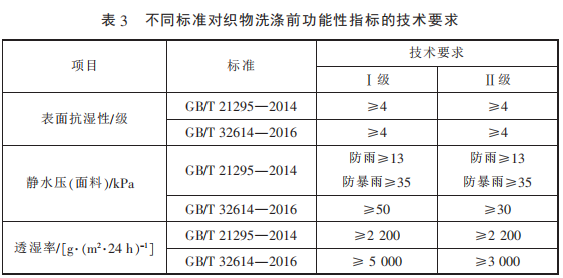 考慮到防水透濕面料功能的 耐用性,GB/T 32614—2016 中增加 了對功能性指標的洗后測試,采用 標準 GB/T 8629—2001《紡織品 試 驗用家庭洗滌和干燥程序》 中 的 5A 程 序 洗 滌 3 次 并 懸 掛 晾 干,洗 后的指標要求變化具體見表 5,相 較于洗前,指標略有降低。