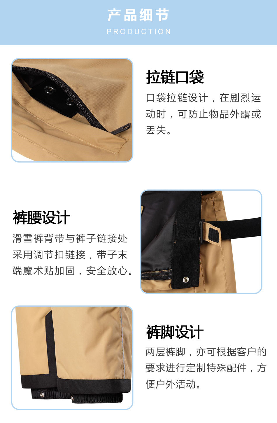 褲腰設計:戶外滑雪褲加工的背帶與褲子鏈接處采用調節扣鏈接,帶子末端魔術貼加固,安全放心。