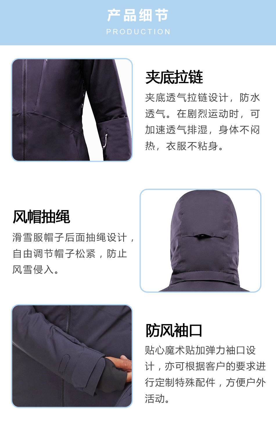 風(fēng)帽抽繩:防水滑雪服定制出的帽子后面抽繩設(shè)計(jì),自由調(diào)節(jié)帽子松緊,防止風(fēng)雪侵入。